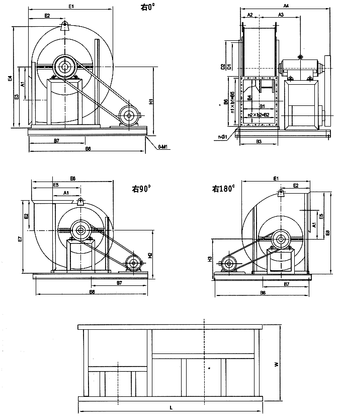風機分左旋和右旋兩種型式,從電機(皮帶輪)側正視,葉輪按順時針方向旋轉為右旋,逆時針旋轉為左旋。A式為電機直聯傳動, B、C、E式為皮帶傳動,D、F式為聯軸器傳動。